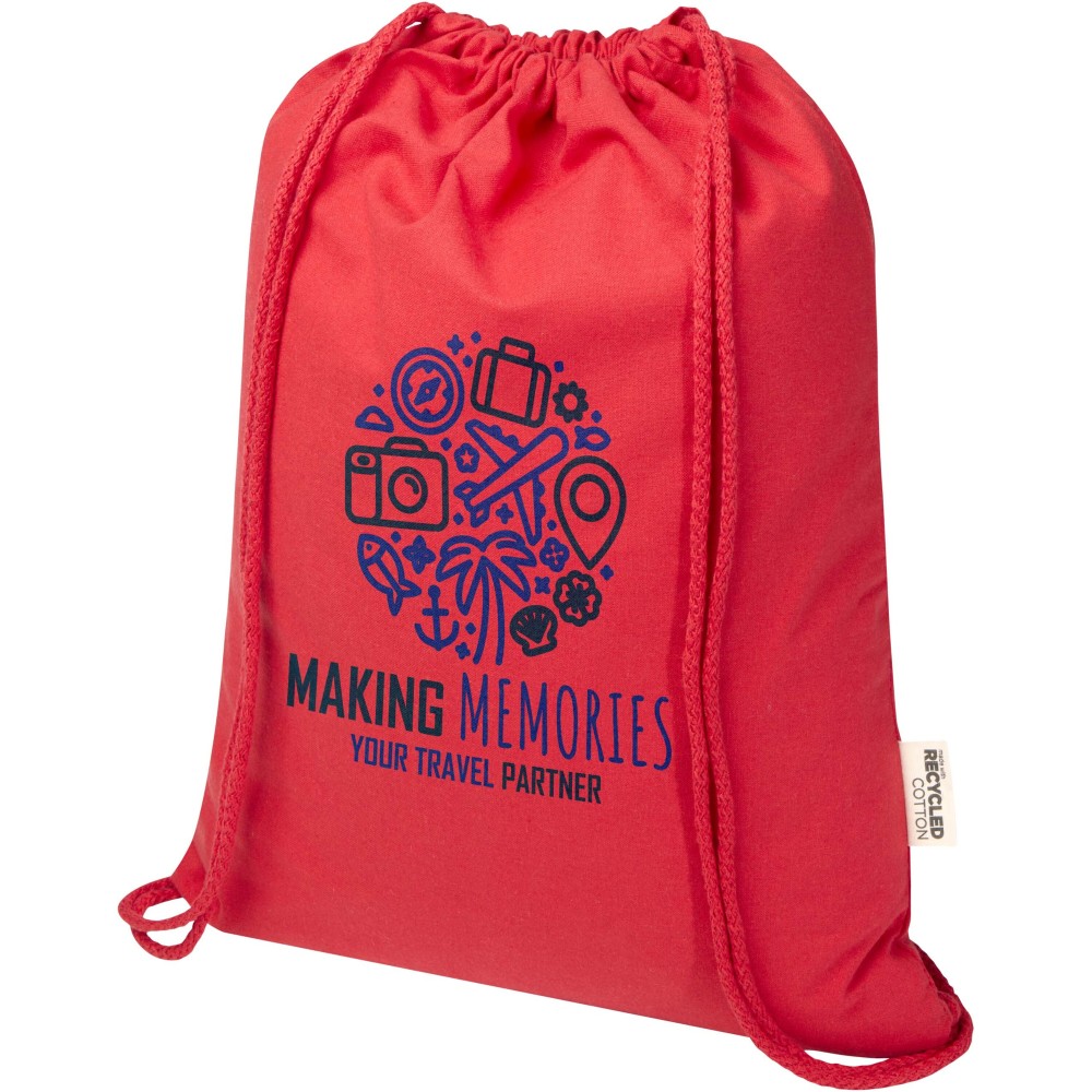 60% újrahasznosított pamutból és 40% RPET-ből készült, GRS tanúsítvánnyal rendelkező tornazsák. Egyszerre erős és könnyű megoldást kínál a mindennapi használatra. Kényelmesen hordható háton vagy vállon, nagyméretű főrekesze pedig a pamut összehúzó zsinórral gyorsan nyitható és zárható. A 180 g/m2 súlyú anyag tartós, és bőséges felületet biztosít logók vagy üzenetek megjelenítésére, így ideális promóciós ajándék márkaépítéshez vagy kampányokhoz. A hátizsák teherbírása max. 5 kg.