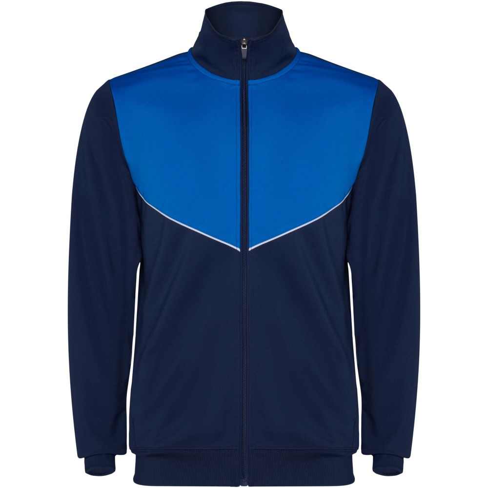 Könnyű és rugalmas anyagból készült melegítő. A végig cipzáros felső kontrasztos színű és varrású díszítésekkel dekorált a mellrészen. Oldalzsebek. Bordázott ujj- és és derékpasszé. Nadrág gumis derékkal és húzózsinórral, kontrasztos oldalsó varrással. Cipzáras szegély.