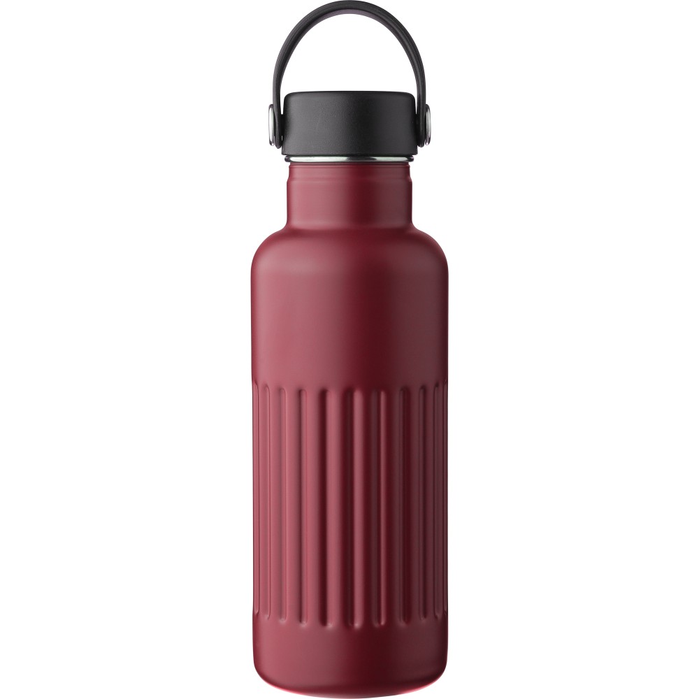 Újrahasznosított rozsdamentes acélból készült, duplafalú ivópalack 500 ml űrtartalommal. Belső része 304-es, külső része 201-es rozsdamentes acél bordázott felülettel. PP és vas kombinációjú kupakkal rendelkezik, TPE hordozópánttal a könnyű szállításhoz. A palacktesten gravírozott recycled (újrahasznosított) alapanyagra utaló logó található. Darabonként barna kartondobozba csomagolva.